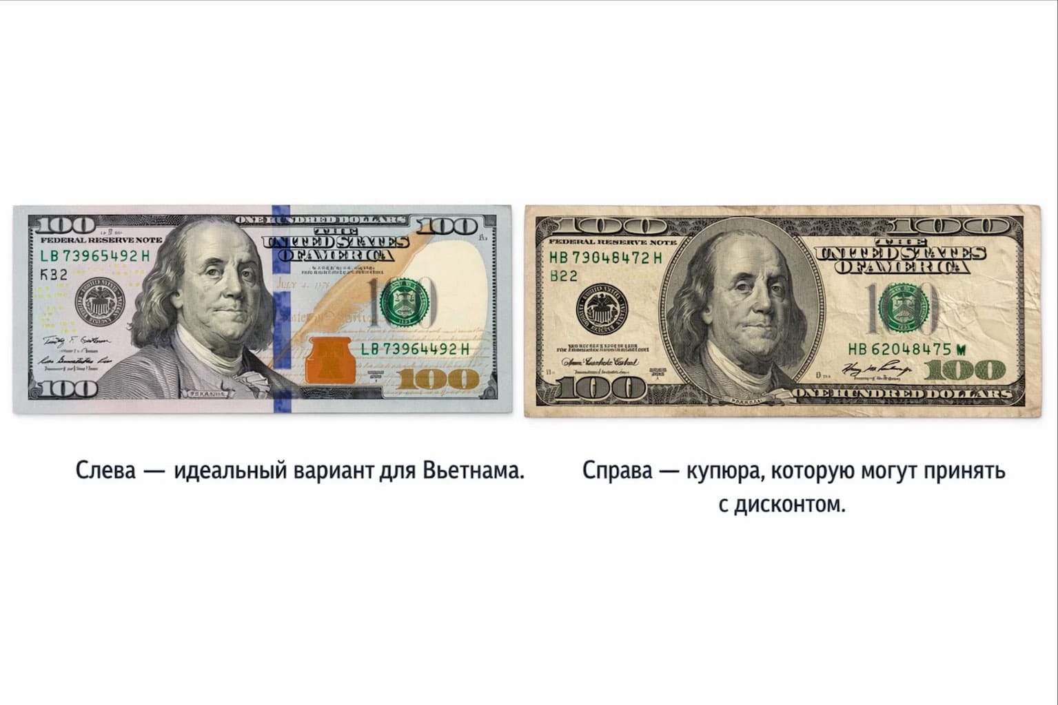 В России или Европе мы привыкли, что 100 долларов — это пять бумажек по 20. Во Вьетнаме это математическое равенство не работает. Здесь существует дискриминация по номиналу.